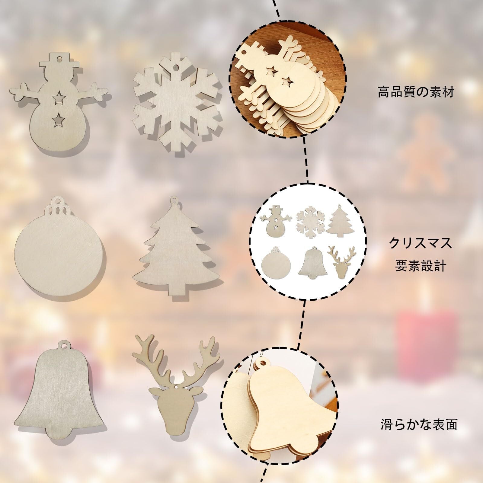 【デザイン】可愛い形、お祝いの雰囲気がいっぱい。両面が滑らかに研磨されているので、ペイントや落書きができます。クリスマスの季節に最適です。