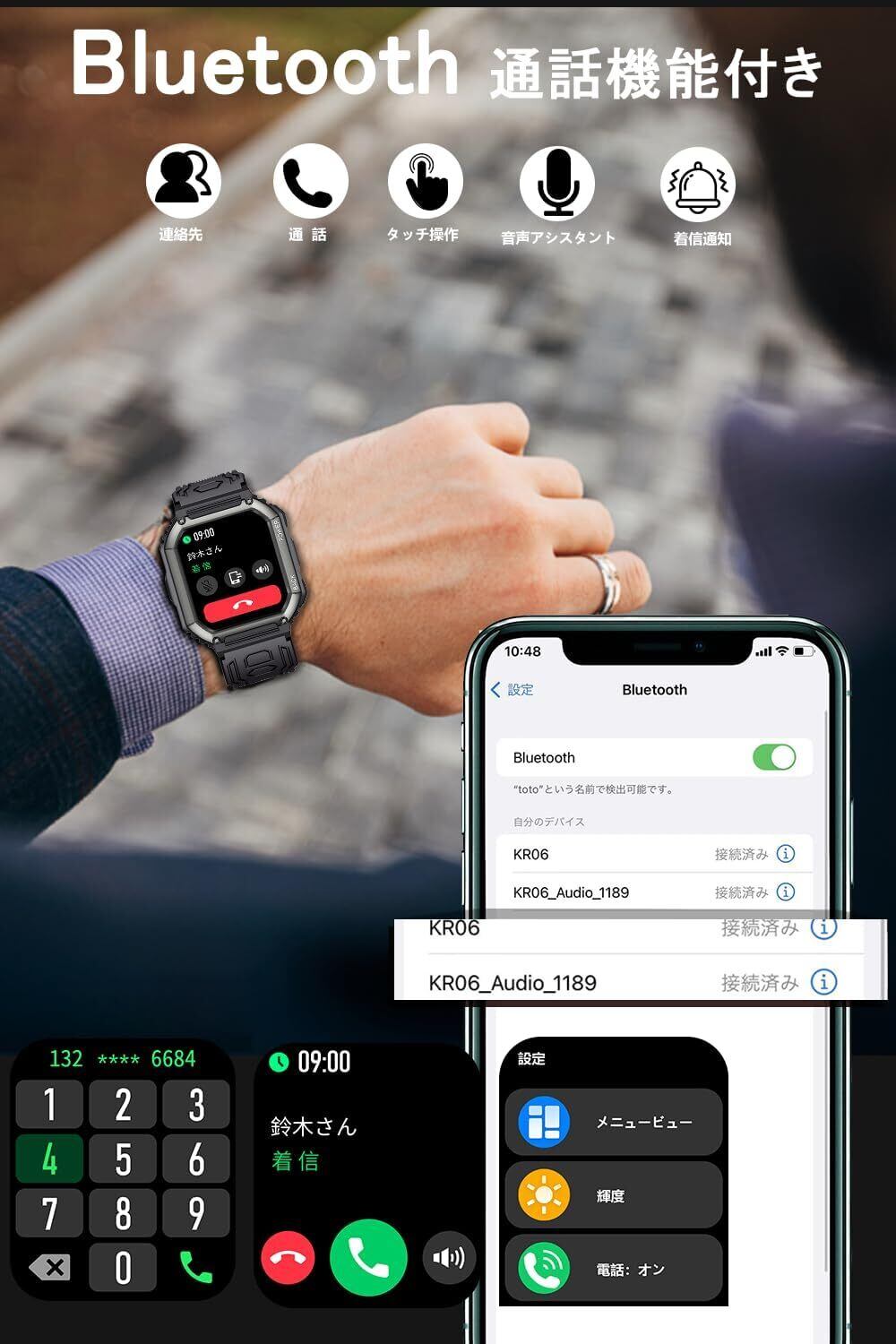 【Bluetooth通話&メッセージ通知機能&音声アシスタント】本スマートウォッチはスピーカー&高性能マイクを内蔵され、携帯電話を出さなくても、スマートウォッチでの通話を実現しました。スマホと接続された後に、着信の応答と拒否/電話をかけることなどができます。通話履歴も表示され、通話記録を保存することもできます。両手を解放し、生活、仕事の効率を更に上げます。 また、着信、SMS、LINE、Twitter、Facebook、Instagram、Whatsapp、skype、Viber、Linkedinなどのメッセージ通知と着信通知をサポートします。スマートフォンを出さなくてもすべての内容を確認できます。メッセージの削除もできます。 最新の音声アシスタントも搭載され、腕時計にアシスタント機能を起動して話すだけでスマホの音声アシスタント機能を起動します。