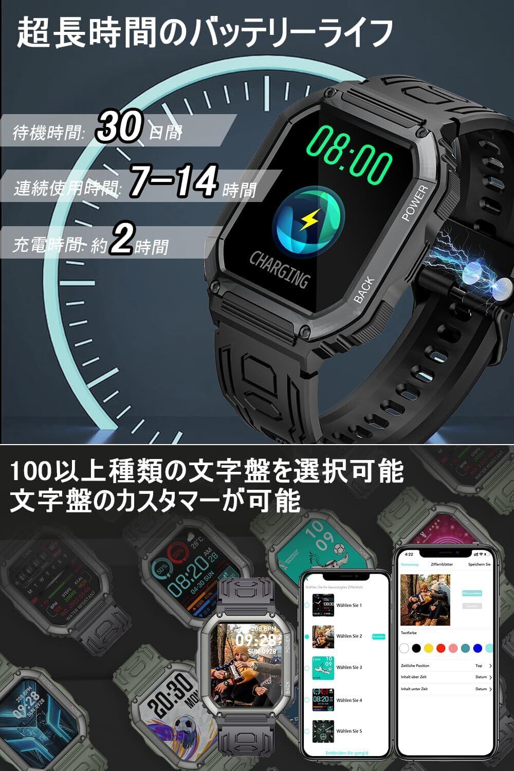 【長持ちバッテリー&文字盤カスタマイズ可能】本スマートウォッチは大容量バッテリーを内蔵し、頻繁に充電する必要がなく、旅行や出張先でのバッテリー切れの心配も不要です。一回のフル充電で5-7日使用でき、電池切れのストレスから解消!(個人の利用状況と電波強度によって、持続利用可能な時間が異なります)。付属の磁気充電ケーブルをスマートウォッチの充電端子に接続すると充電開始となります。また、スマートウォッチ本体の文字盤を搭載する以外、専用アプリで100種類以上の文字盤をダウンロードできるし、お好きの写真も設定可能、家族や恋人、アイドルなどの写真を文字盤の画面に変えることもできます。