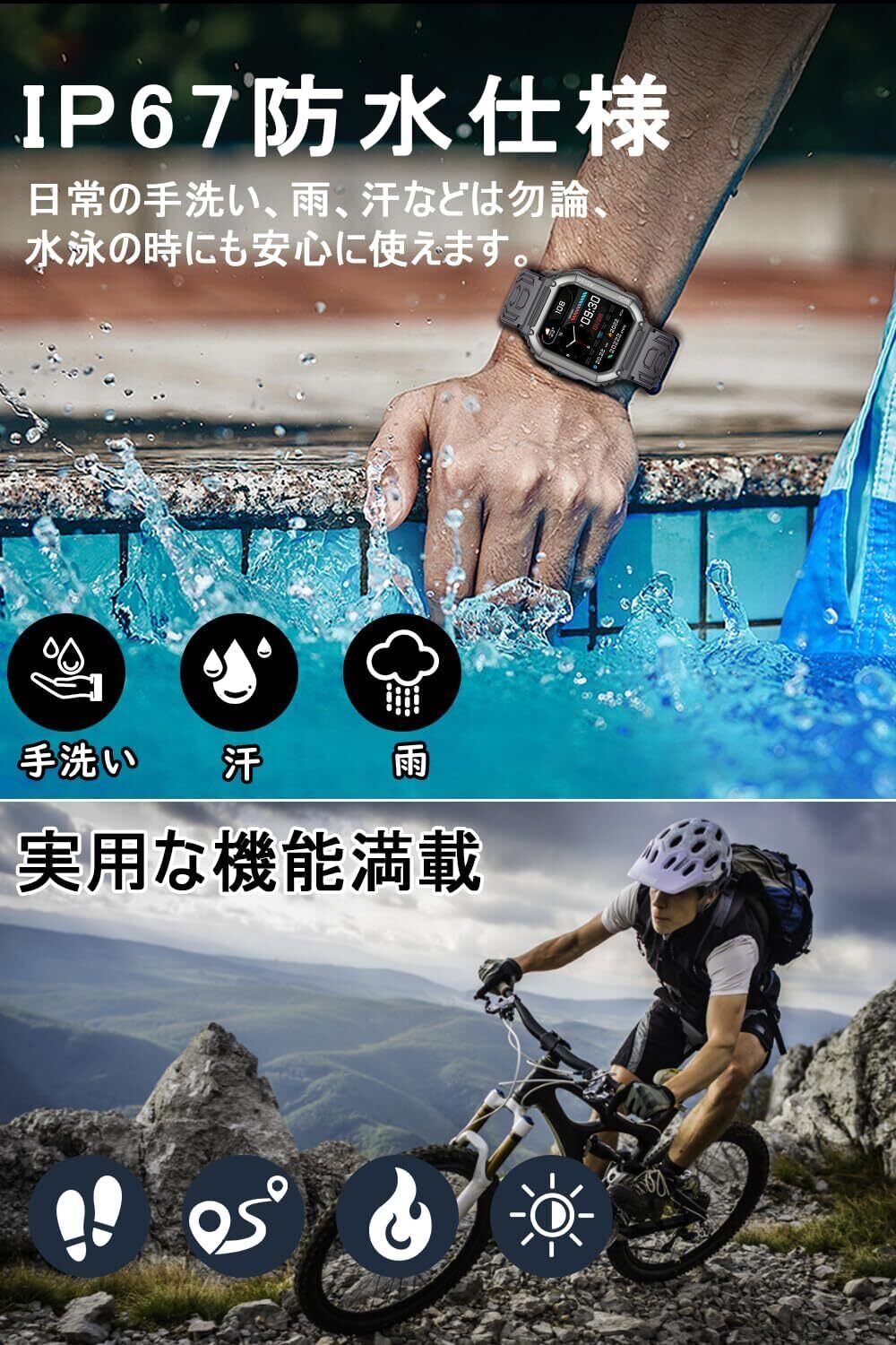 ・内容:「2022最新」のスマートウォッチは、軍用規格に準じた高耐久性を備え、日常のあらゆるシーンで活躍します!Bluetooth通話や着信通知だけでなく、LINEなどの各種アプリ通知にも対応しており、ライフスタイルをより快適にサポートします。