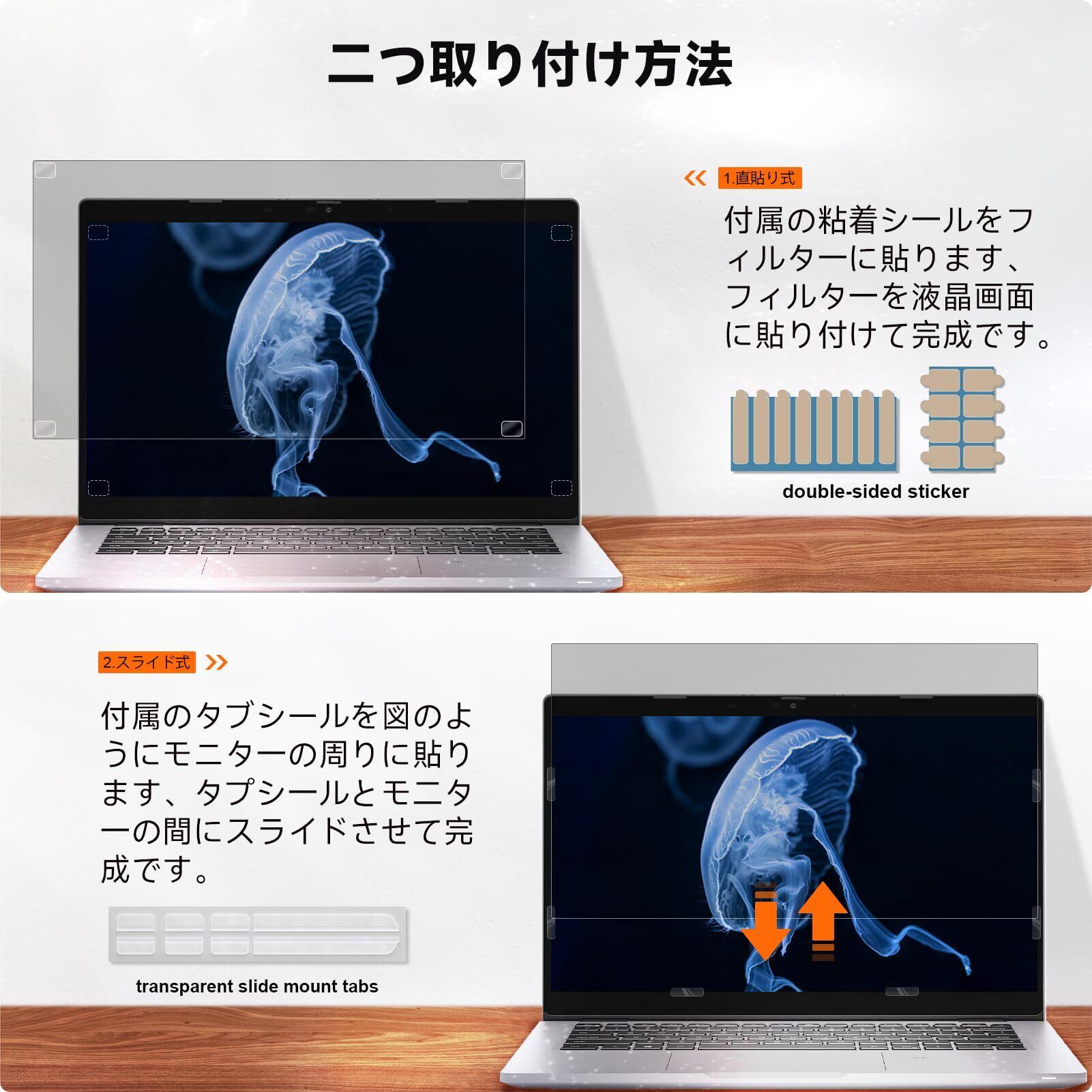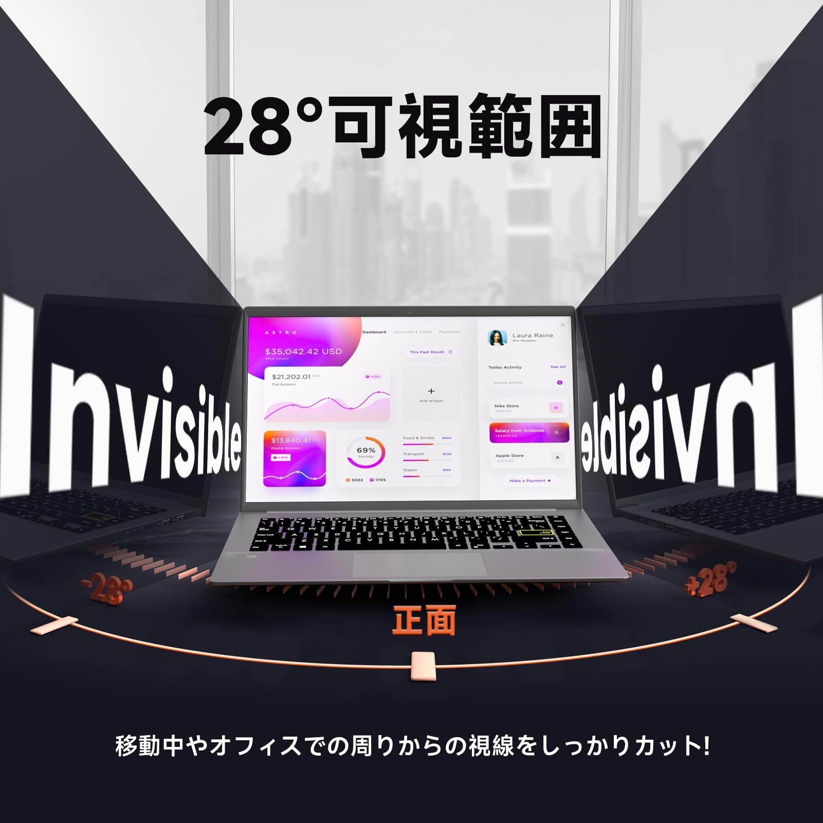 ・特徴:このフィルターは、反射防止機能を備えており、明るい場所でもクリアな映像を提供します。特に公共の場や人混みでの使用において、他人からの視線を気にすることなく作業に集中できる環境を作ります。また、軽量で取り扱いも簡単なので、持ち運びにも便利です。