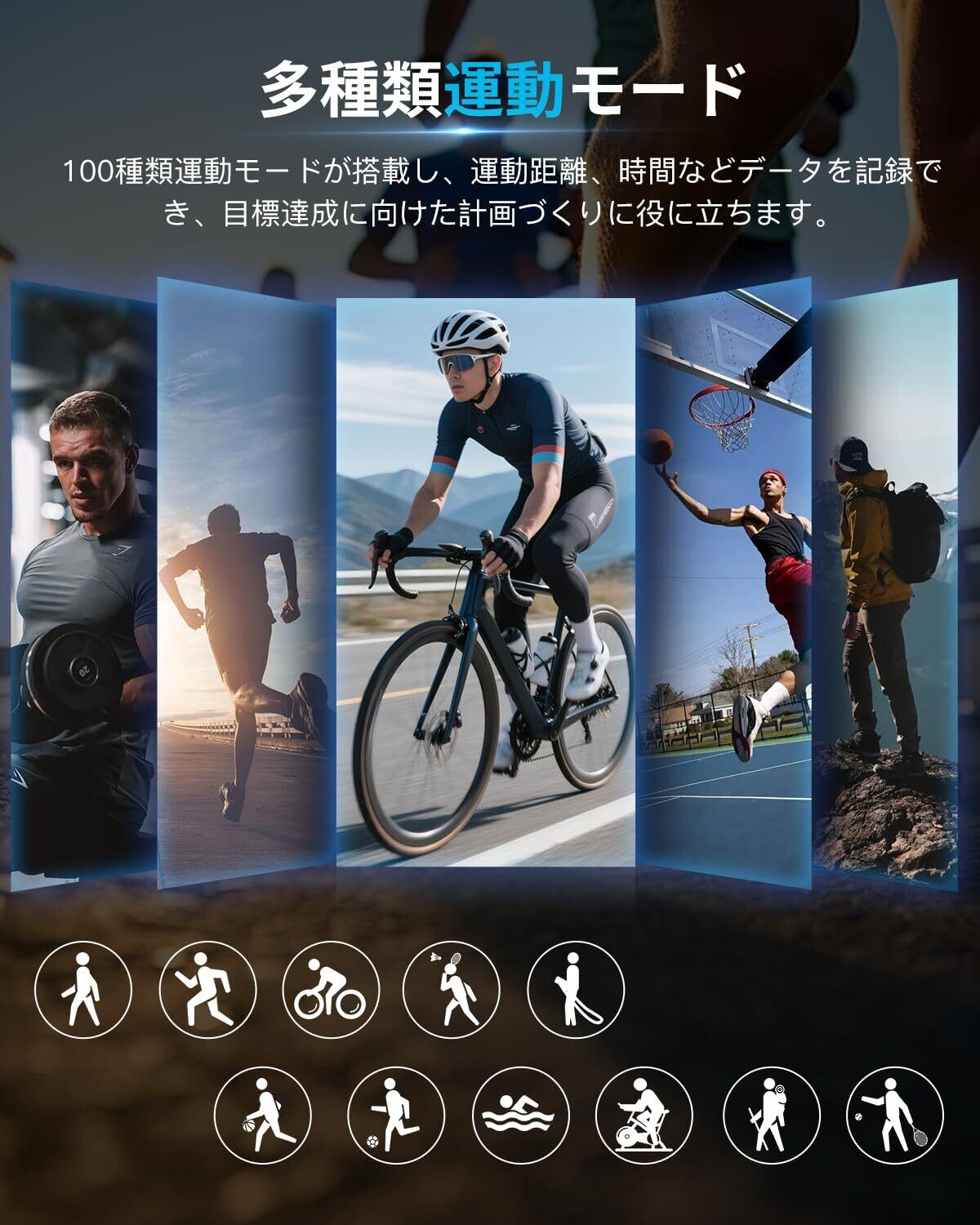 ・特徴:Bluetooth5.3に対応し、高輝度の懐中電灯機能や3ATM防水など、アウトドアでも安心して使用できます。さらに、100以上の運動モードを搭載しており、健康管理やフィットネスにも最適です!耐衝撃設計により、日常のアクティビティでもしっかりと守られます。