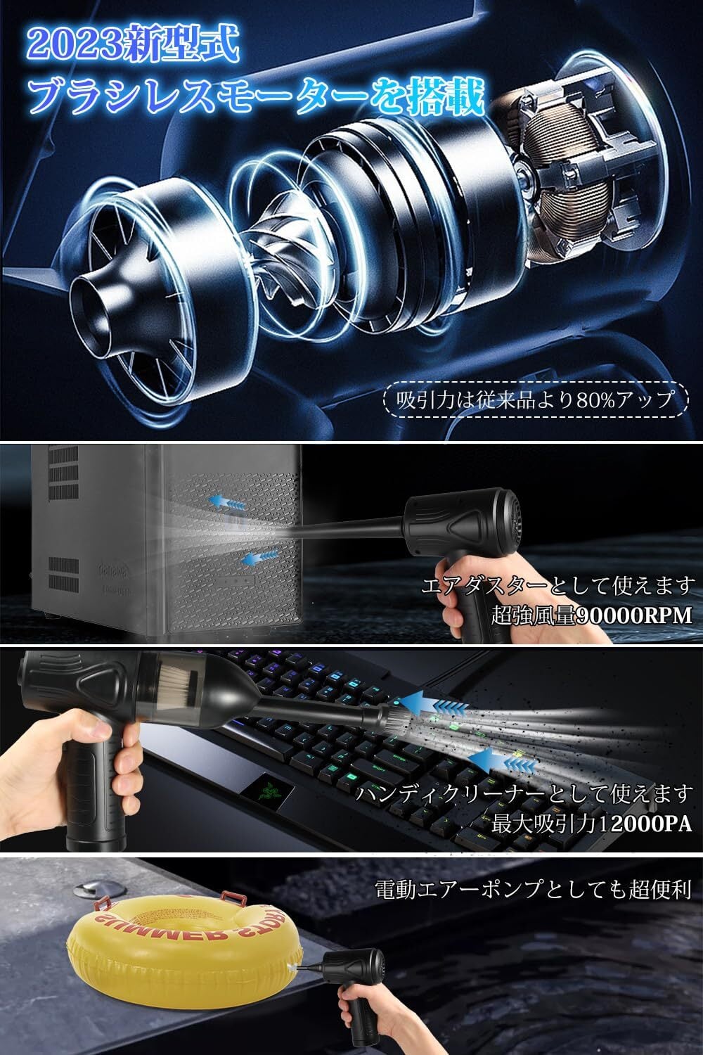 ・内容:このエアダスターは、強力な風速と充電式で手軽に使える便利なアイテムです!最大風速120m/sを実現し、91,000 RPMの高速回転で、さまざまな場面での使用に最適です。コードレス設計で、どこでも自由に使用できるこの製品をぜひお試しください♪