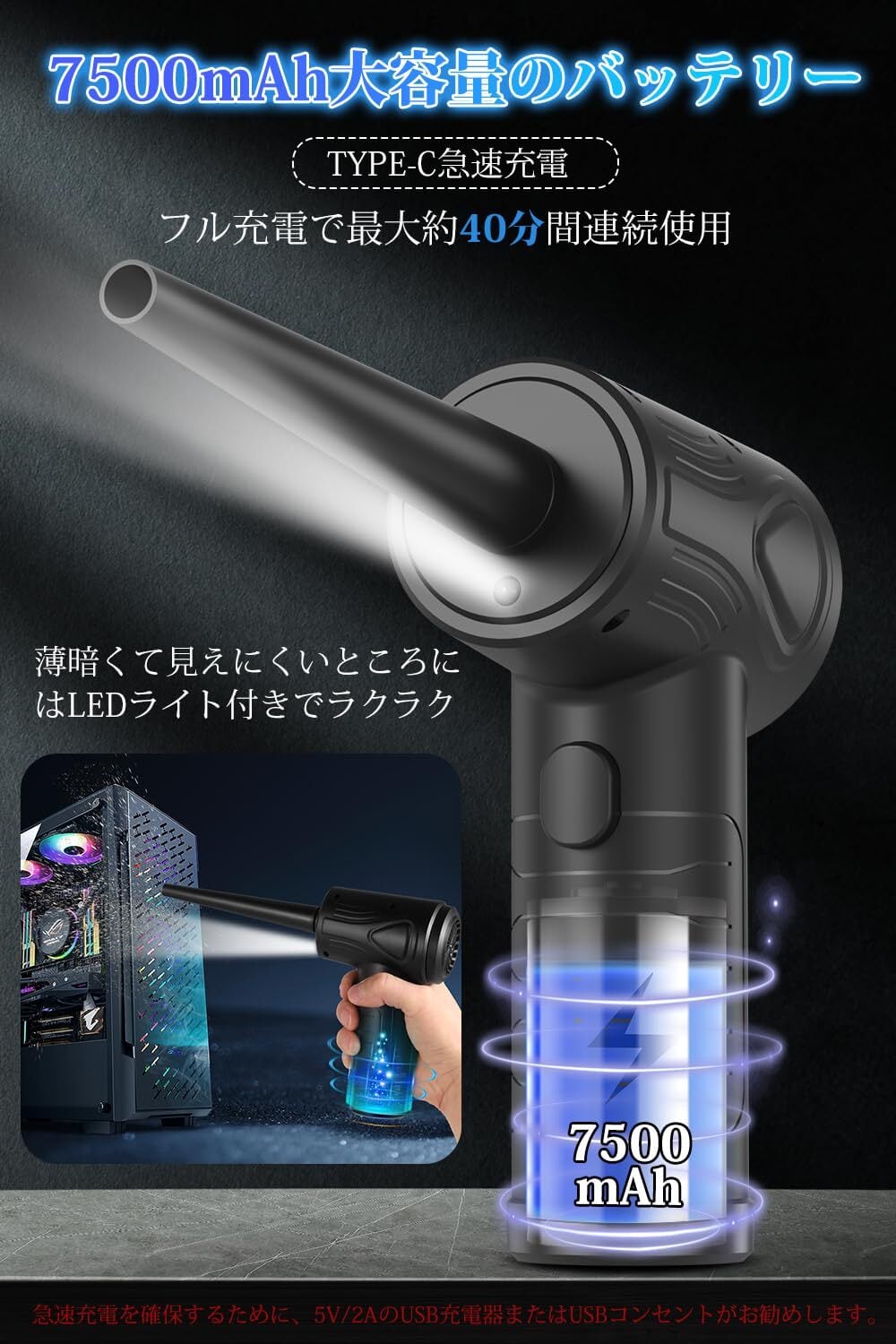 エアダスター 電動 強力 充電式 LEDライト付き 最大風速 120m/s 最強ブロワー 洗車 3段階風量調整 超強力91,000 RPM高速回転 電動エアダスター大容量バッテリー 小型 PC掃除 空気入れ コードレス 日本語取扱説明書 1