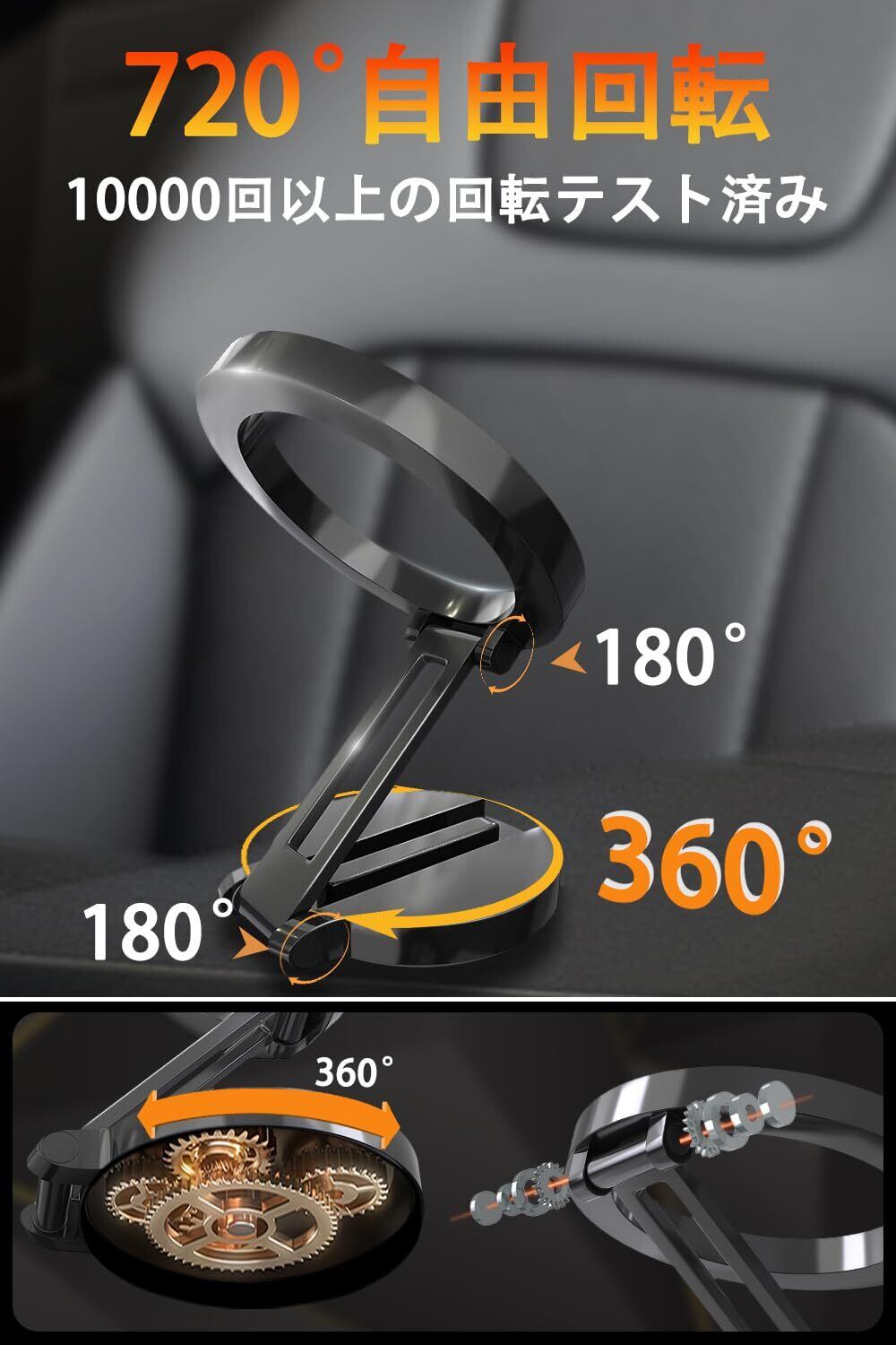 ・特徴:360°自由回転が可能で、あなたの好きな角度でスマホを設置できます。全亜鉛合金の強固な構造により、その安定性は抜群です!折りたたみ式のデザインで、取付も簡単。片手で操作できるため、運転中もスムーズに操作できます。