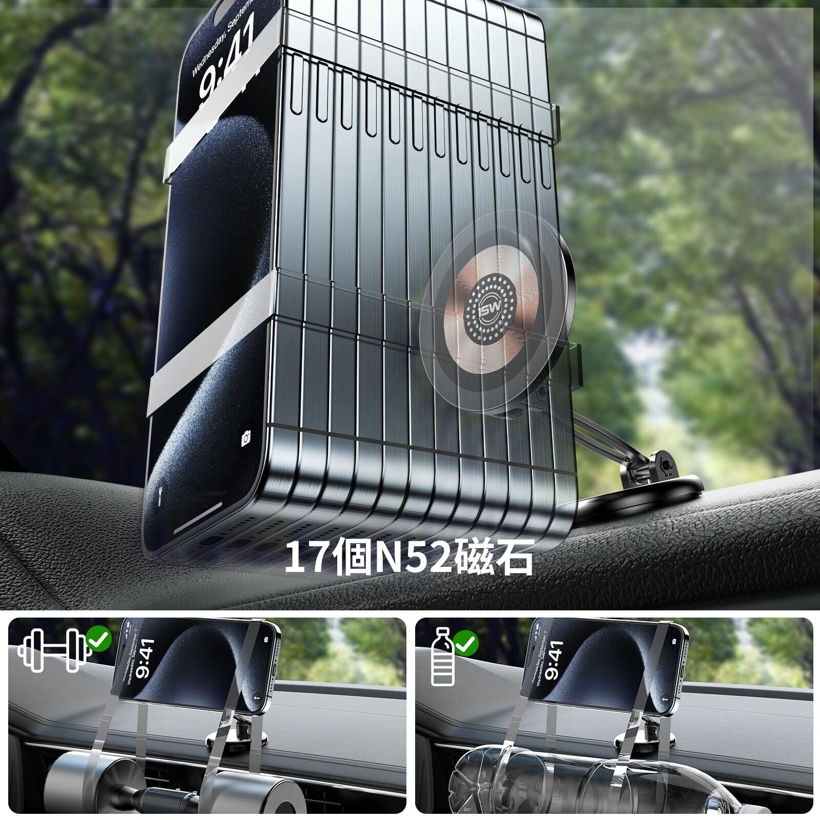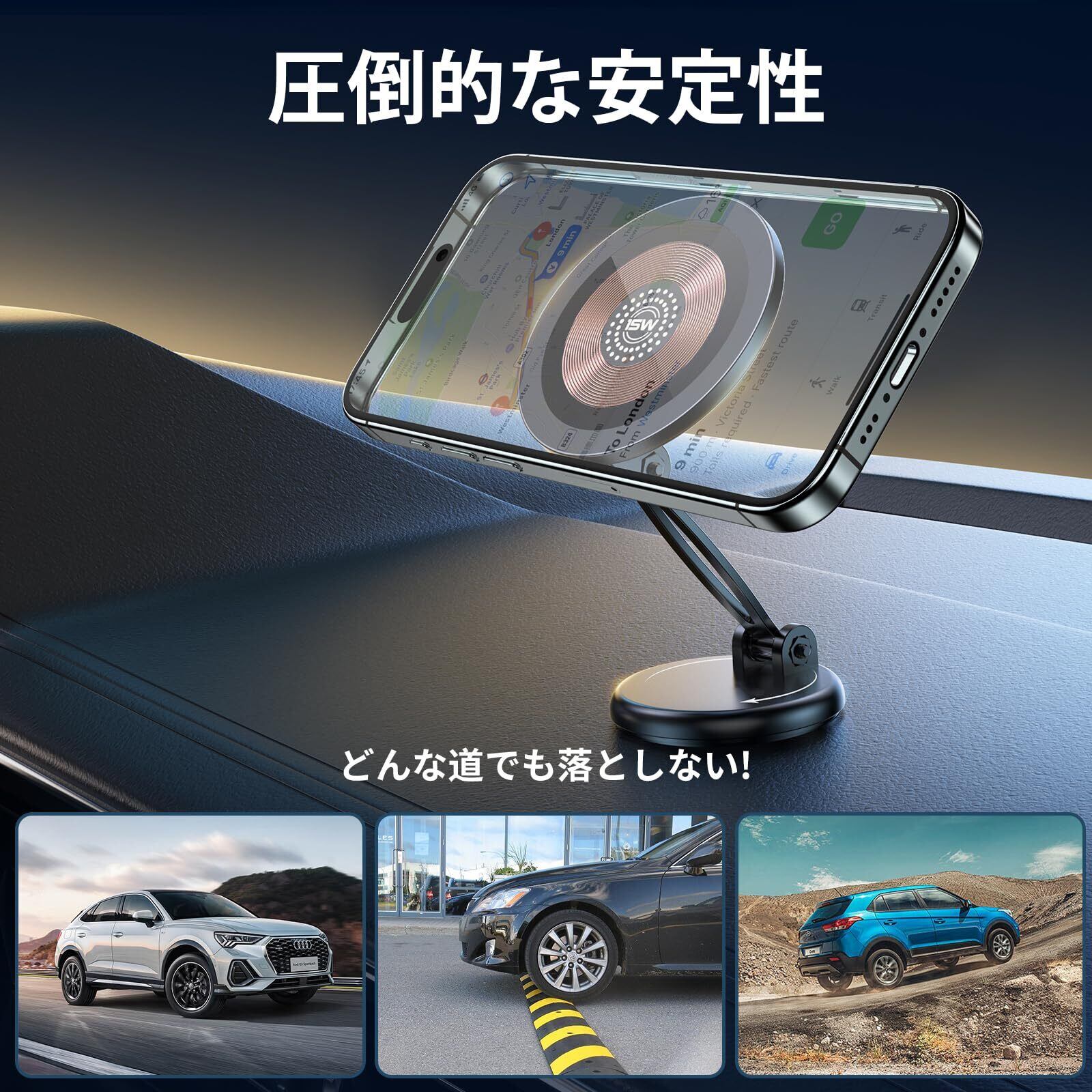 ・特徴:15Wの急速ワイヤレス充電をサポートし、17個のN52磁石が使用されているため、強力な吸着力を発揮します!これにより、スマホが振動や急ブレーキで落ちる心配がありません。また、取り付けが簡単で、さまざまな車種やデバイスに対応しています。