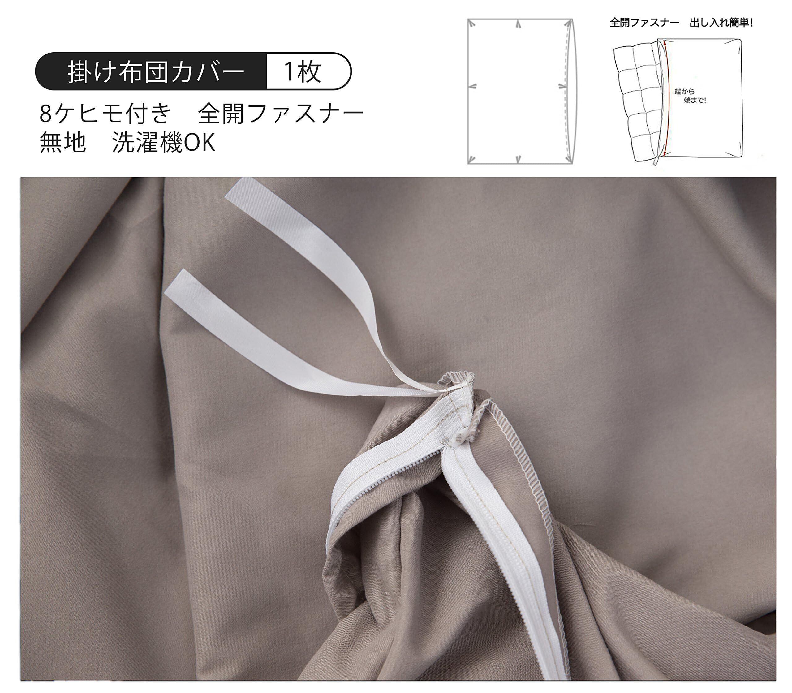 【和式用仕様】掛布団カバー:片側全開ファスナー使用,布団留めひも8ヶ所 / 敷布団カバー:全開ファスナー使用、敷布団全体をすっぽり包むタイプです。/ ピロケース:中かぶせ式、ファスナーなどの金属バーツがないので、就寝時にじゃまになりません。