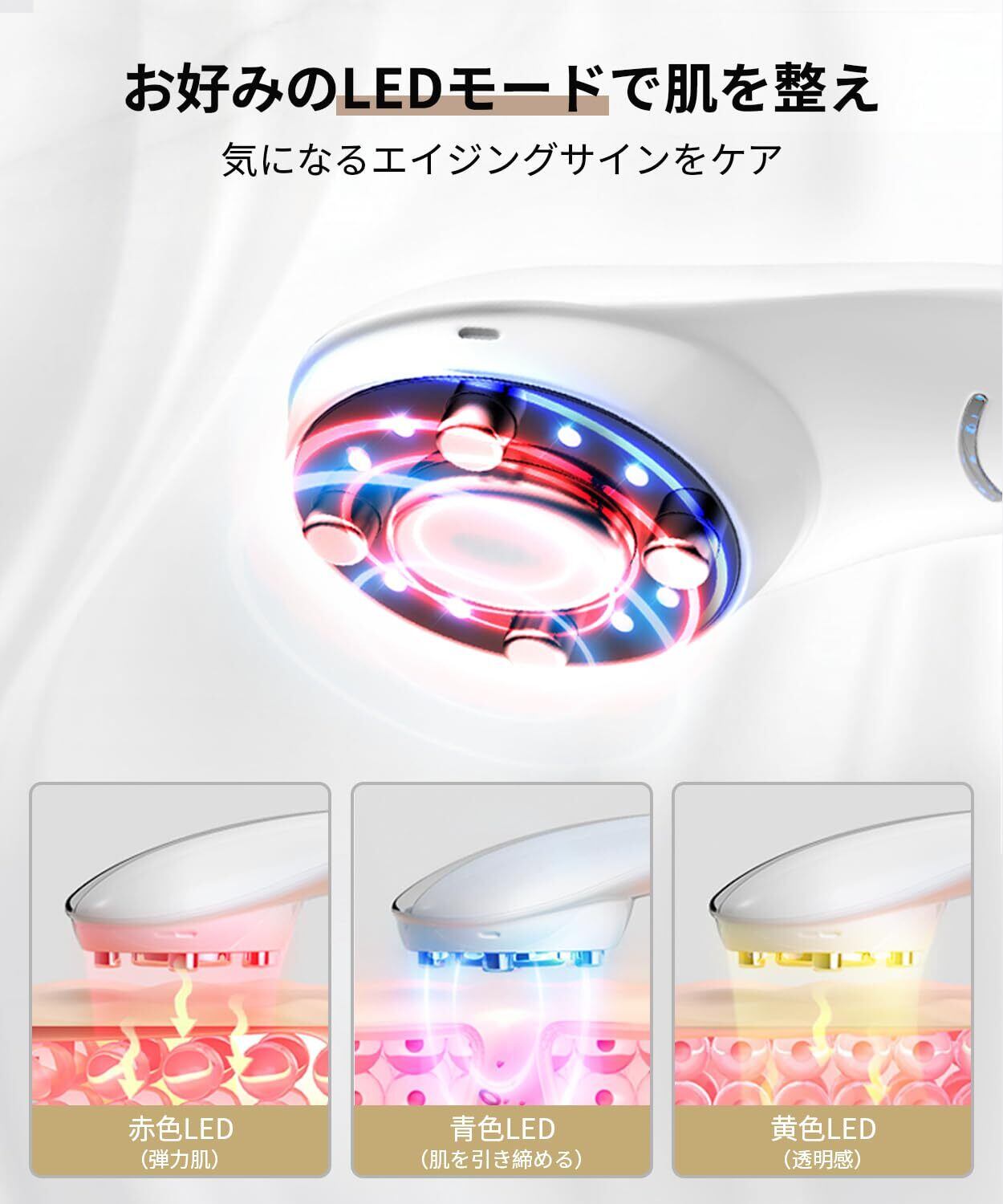 【本格的な光エステ・EP-L技術・VR振動】多機能美顔器は3種類の光波がついており、赤色LEDモード、青色LEDモード、黄色LEDモード、赤.青.黄LED繰返しモードです。お肌の状態により相応しいLEDモードをお選びいただけ、ハリツヤのあるモテ肌に導く、肌の透明感を高めます。EP-Lモードは電気パルスで表皮細胞に電子孔を形成し、有効美容成分を皮膚の深部まで浸透させます。VR振動は、肌の血行を促し健康的な自然な肌つくりに導きます。