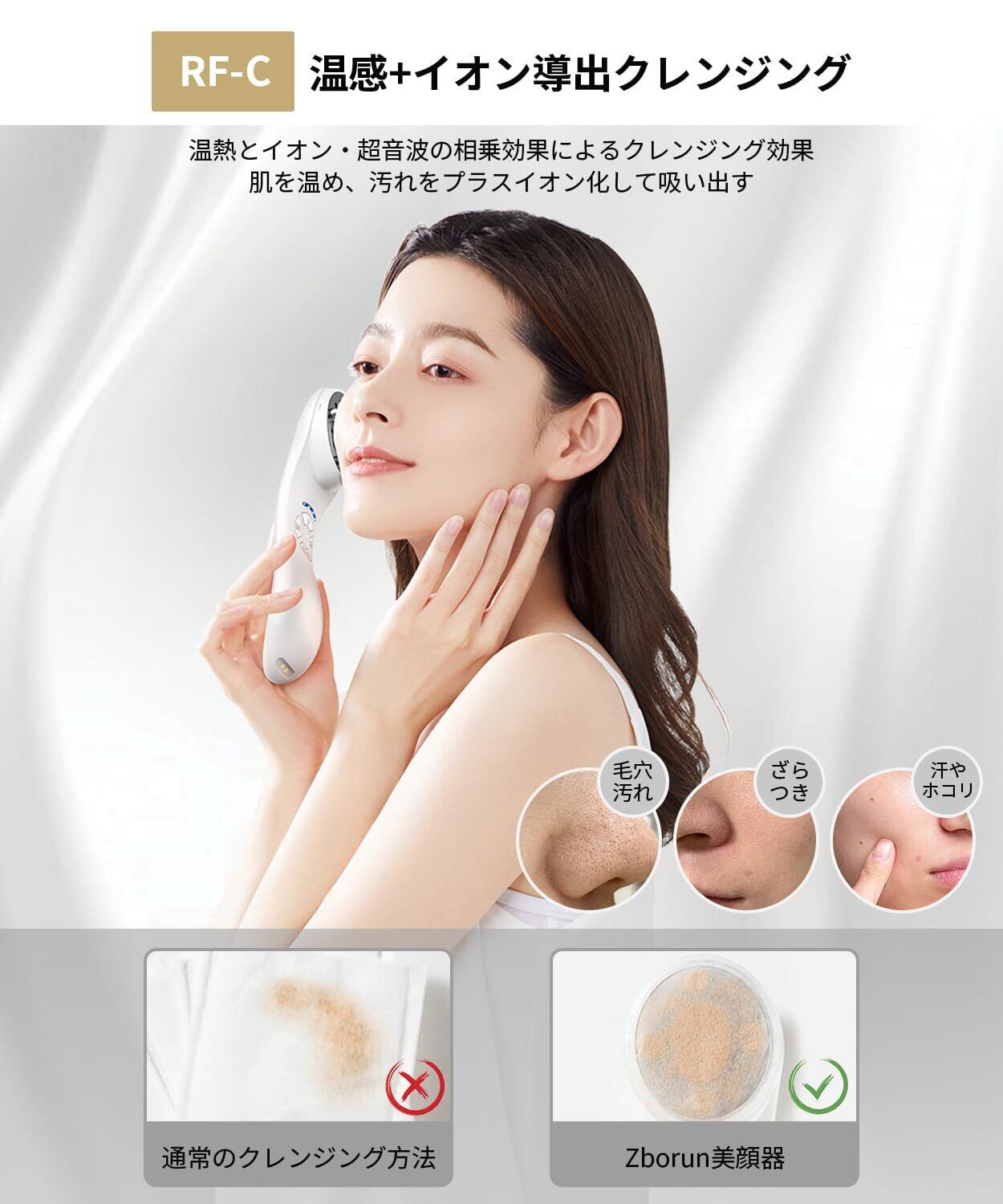 【1台多役・イオン多機能美顔器】Zborun美顔器は独特なテクノロジーを採用しており、美容成分をイオン化して、肌の深部にまで届けます。RF-CとRF-P機能、LED、VR、EP-Lなどの機能を一台にまとめることで、様々なお肌に対応して全面的に集中ケアを実現しています。超軽量で(約126g)、外出時にも持ち運べるサイズ感も魅力です。EMS微電流も搭載して、美顔器の独自の周波数で、顔を電気で刺激して、筋肉にアプローチします。毎日15分間のケアを続けて、25日間で確実な効果を実感できます。