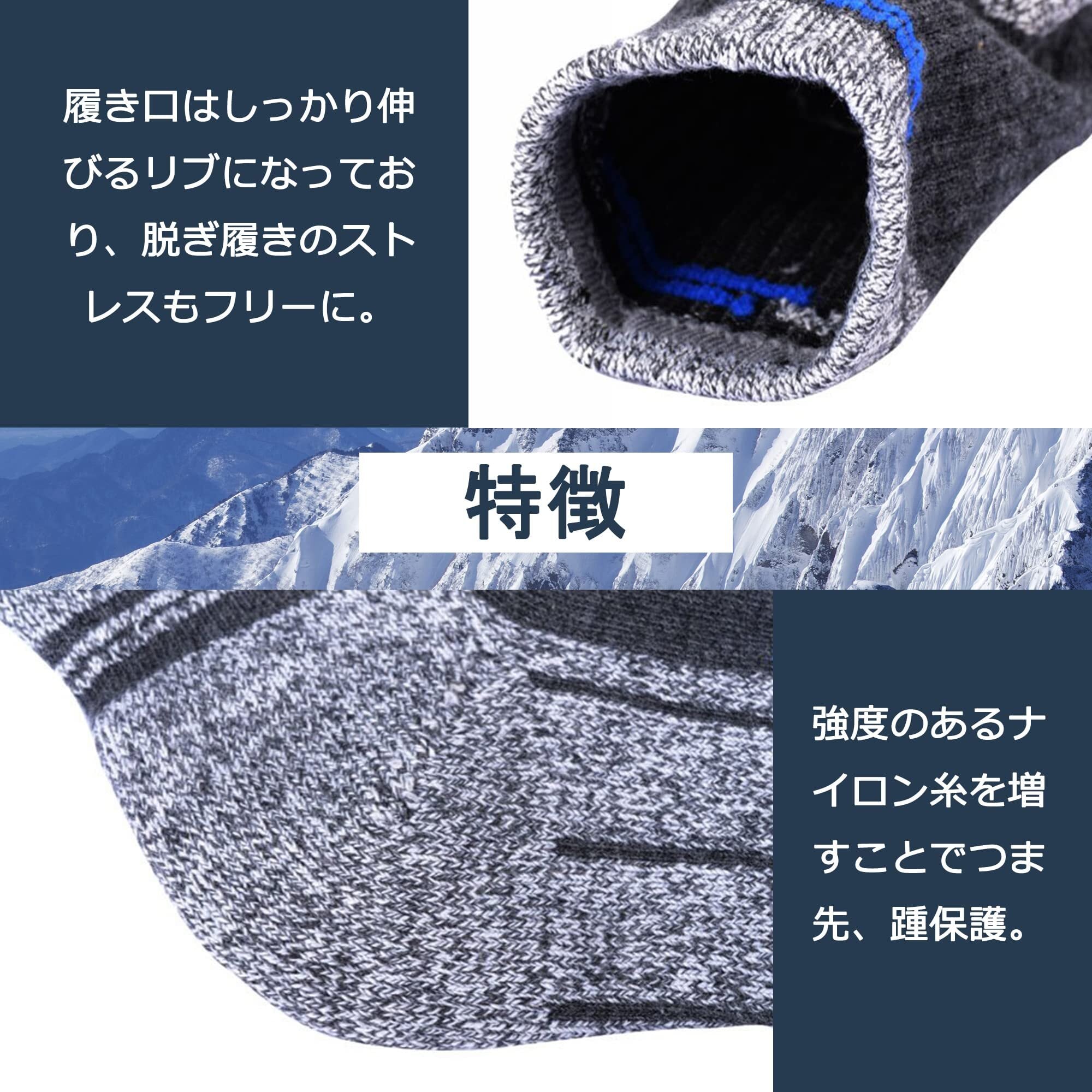 ・特徴:綿素材を使用したこの靴下は、肌触りが良く、快適な履き心地を実現。通気性にも優れており、足元をムレにくくしてくれます。特に、登山やウォーキングなどのアクティブなシーンに最適で、長時間の使用でも安心です。これらの機能が揃っているため、どんなアクティビティでも心地よさを感じられることでしょう。