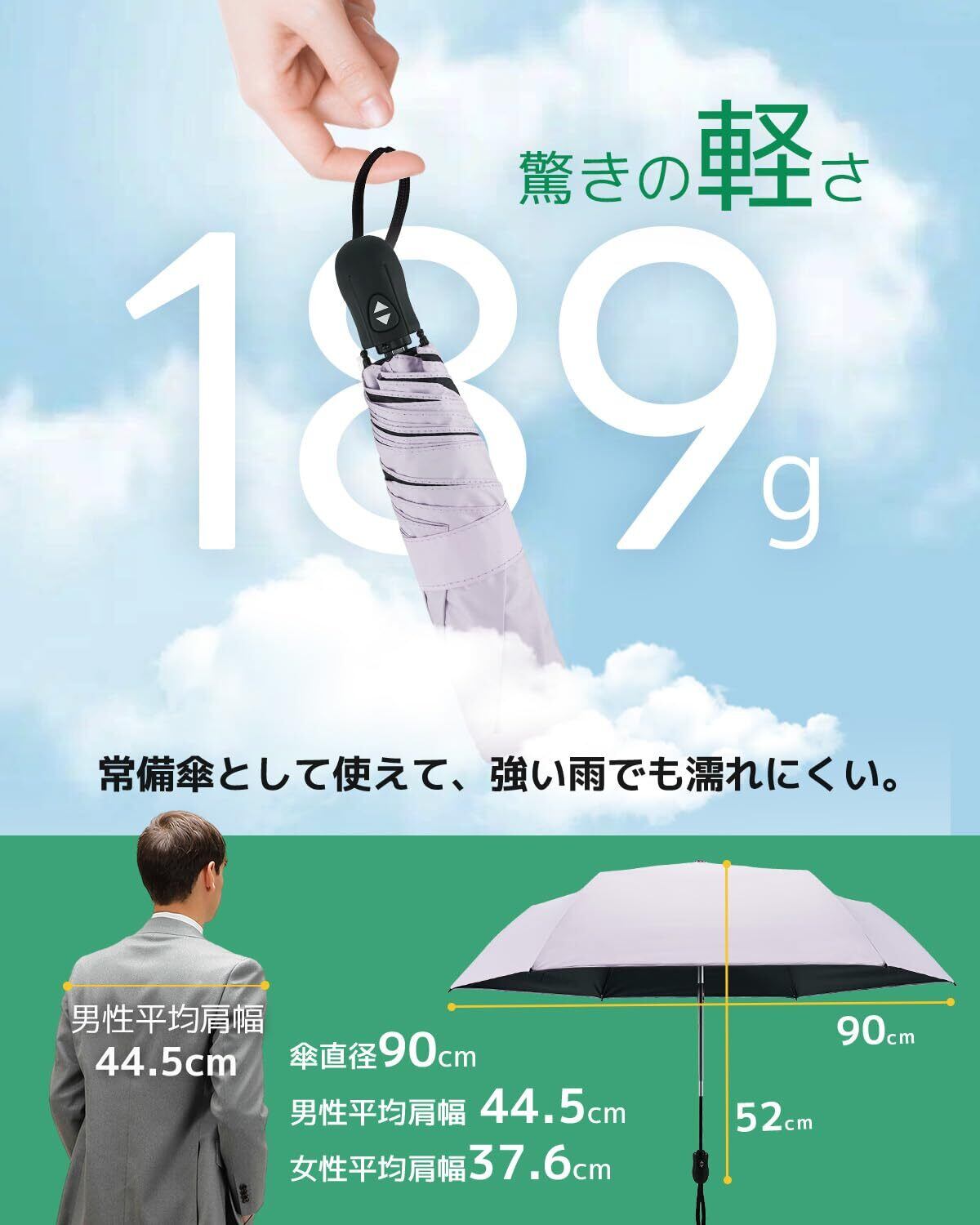 ・特徴:重量はわずか189g~199gと非常に軽量であり、持ち運びが簡単です。ワンタッチ自動開閉機能を搭載しているため、使いやすさも抜群!特殊な反射冷却素材を使用しており、直射日光を避けながら反射効果で涼しさを保持します。また、耐風撥水の機能も備えているため、晴れの日だけでなく、急な雨にも対応可能です。