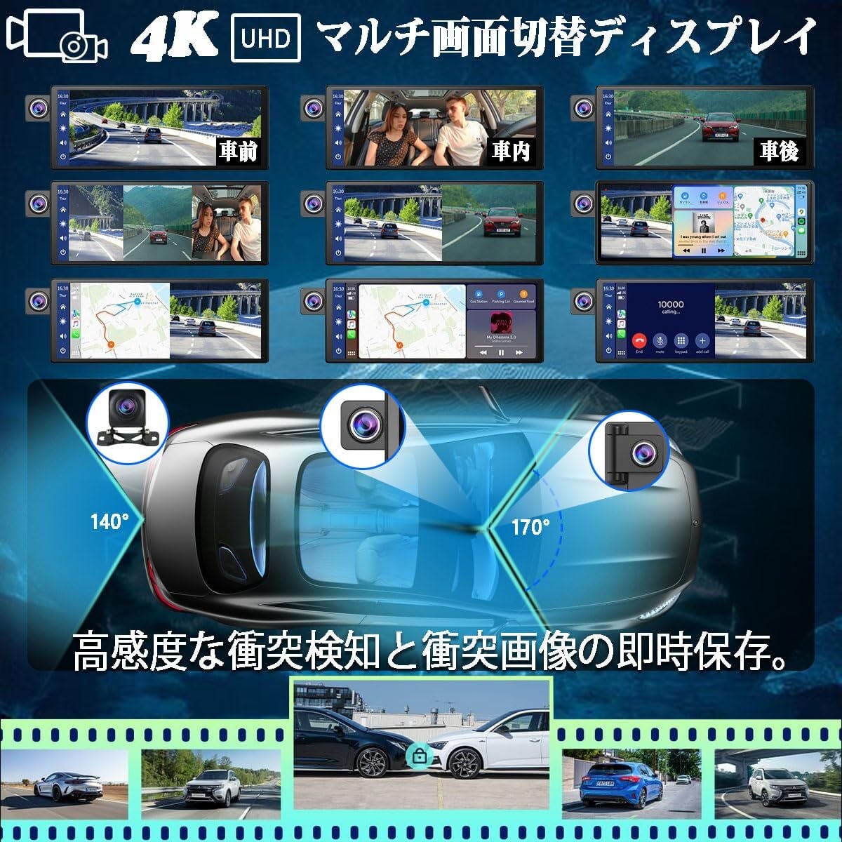 【4Kフロントカメラと1080Pリアカメラ搭載】単なる「ディスプレイオーディオ」ではなく、ドライブレコーダーとしても機能し、市場最高クラスの180°調整可能な4Kピクセルフロントカメラ2台と、IP67防水仕様の1080Pリアカメラを搭載し、「前方・車内・後方」の録画機能を実現。ダッシュ カメラの分割画面機能を使用すると、前方と後方の映像をリアルタイムで同時に表示できます。ドライブレコーダーは前方の道路と車内の超高解像度映像を撮影し、リアカメラは安全な駐車をお手伝いします。オールインワンの「ディスプレイオーディオ ドラレコ」でコストを大幅に削減します。