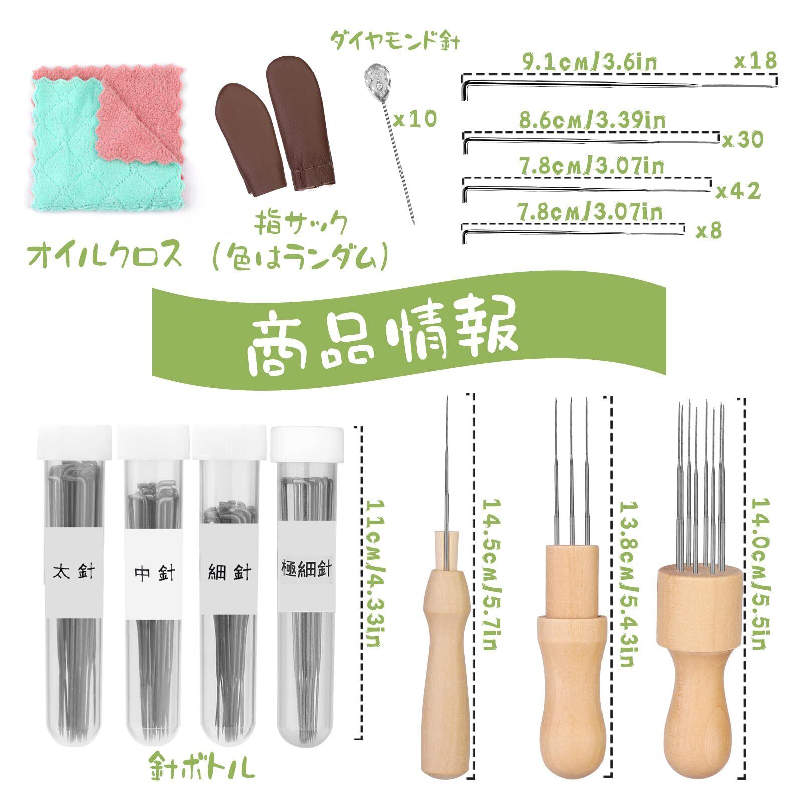 完全なフェルトツールキット: 4 つの異なるサイズの針、18 本 * 36 ゲージ、30 本 * 38 ゲージ、42 本 * 40 ゲージ、8 本 * 42 ゲージのフェルト針が含まれます。 針ハンドル3個、指サック1組(色はランダム)、クリーニングクロス1個、針ボトル4個、さまざまなニーズを満たすことができます。