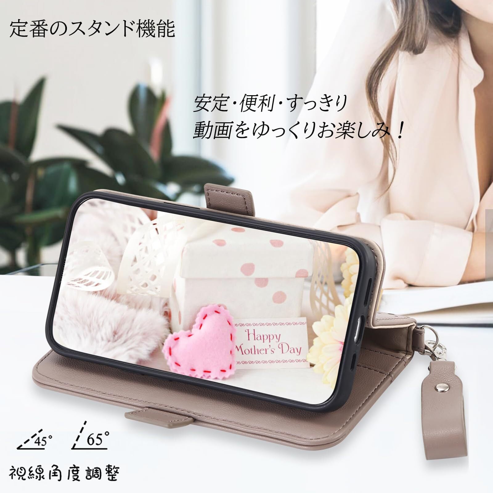 ・用途:カジュアルな日常使いや、特別なオケージョンにも最適なこのケースは、さまざまなシーンで活躍します♪また、スマホスタンド機能を備えており、動画視聴やオンライン会議なども快適に行えます。