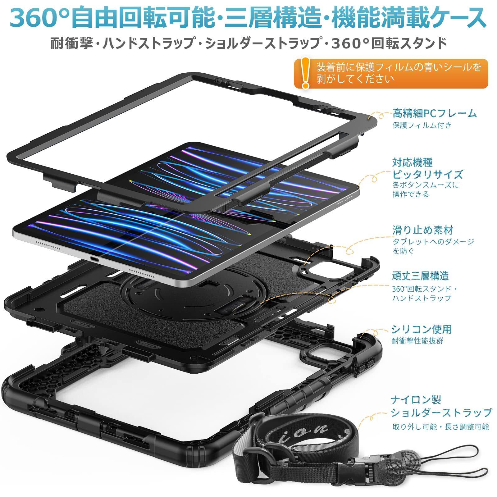 【人気商品】SEYMAC stock 11インチiPad Pro 第4世代 2022 ケース 耐衝撃 保護フィルム付き ペン収納 360°回転スタンド ハンドストラップ ショルダーストラップ 全面保護カバー iPad Pro 11第4世代/第3世代/第2世代/第1世代専用型(ブラック)