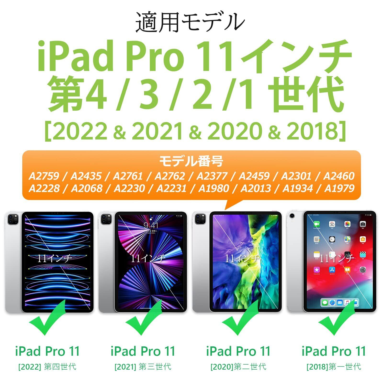 【対応機種】:本品は11インチiPad Pro第4世代/第3世代/第2世代/第1世代専用デザインです。型番:A2759/A2435/A2761/A2762(2022,第4世代)A2377 / A2459 / A2301 / A2460(2021,第3世代)、A2228 / A2068 / A2230 / A2231(2020,第2世代)、A1980 / A2013 / A1934(2018,第1世代)のみに適用されるため、ご購入前に必ずご確認ください。※ご注意:2024年発売の2024 11インチiPad Pro(M4) 及び2024 11インチiPad Air (M2) は適用できないためぜひご確認ください。