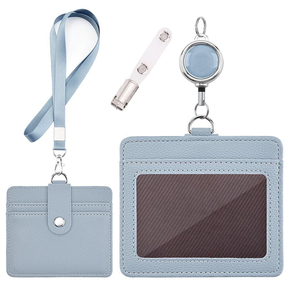 IDカードホルダー - 横型&縦型 IDカードケース 社員証 定期入れ ネームホルダー 両面用 名札 パスケース 胸ポケットクリップ&伸縮リール式 クリップストラップ付き (横型ブルー)