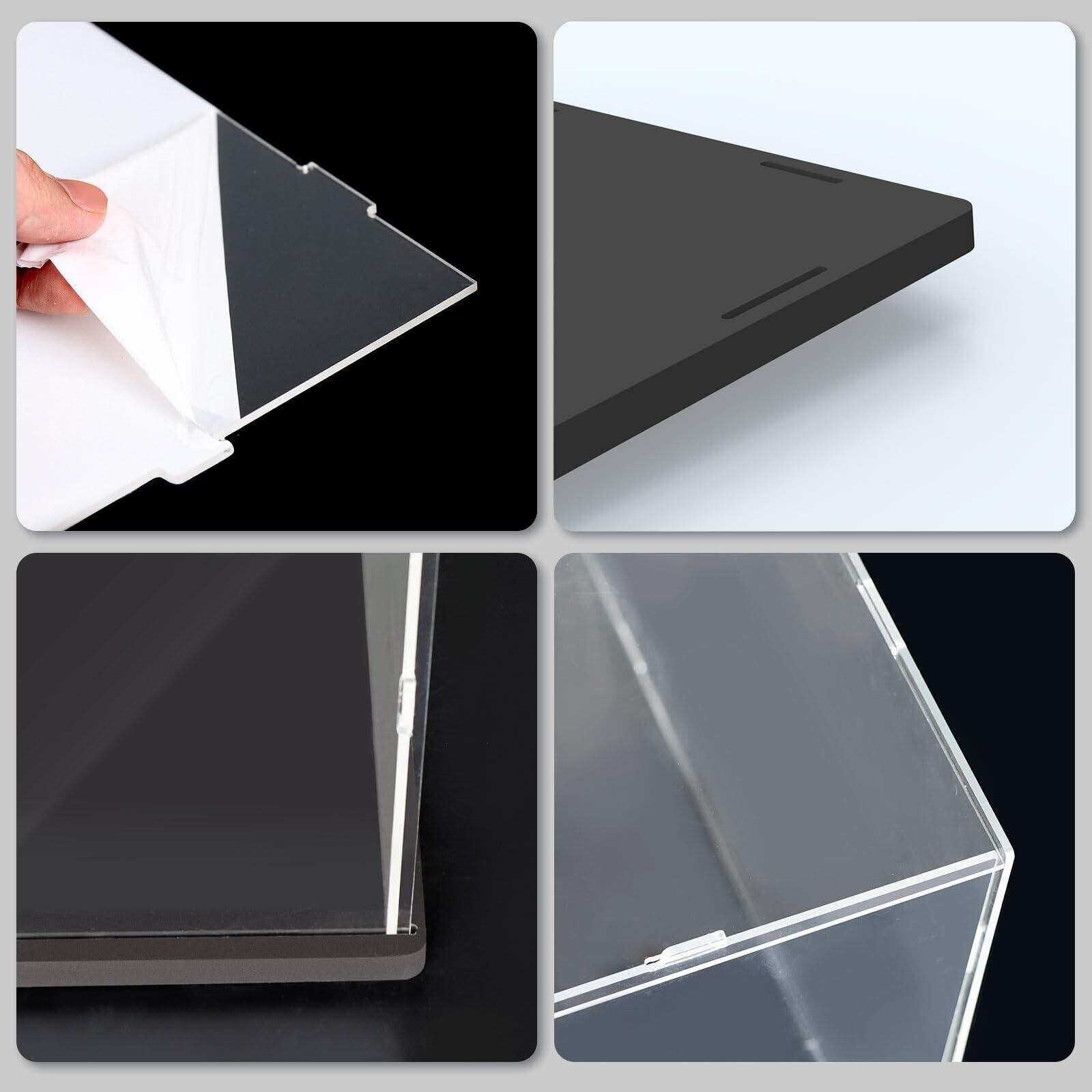 素材:ディスプレイケースは、透明度の高いアクリルパネルと、PVCマイクロフォームパネルベースで構成されています。アクリルパネルに傷がつかないように、両面のアクリルパネルを保護フィルムでラミネートしています。